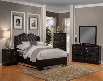 Warm Mar Resistant Black Finish with Ultragloss Tops and Vine Motif Drawer Front Detail. Beautifully Shaped Nostalgic Upholstered Bed Featuring Deep Tufted Leather Like Finish (P U) with Crystal Jeweled Buttons. Post and Crown Finished in Black Crocodile Finish (P U) with Silver Nail Head Accents. Upholstered Side Rails and Footboard.Luxurious Styled Case Pieces with Shaped Under Top Molding. Soft Ogee Edge Drawer Fronts with a Delicate Vine Motif Detail. Case Pieces Also Feature Tapered Legs with Scallop Bottom Rails. Vintage Polished Silver Diamond Knobs. Nicely Scaled Picture Framed Mirror with Beveled Edges. Smooth Operating Steel Roller Glide Runners. Assembled in the USA