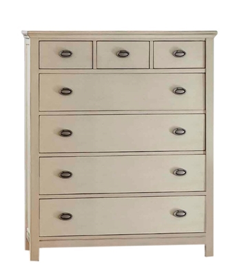 Finish Color: Creme Dimension: 44" x 18" x 52" Solid wood framing and expertly finished solid wood veneers. Natural water hyacinth accents.Full extension, ball bearing side glides on drawers, French dove tail in front of drawers. English on dove tail in rear of drawers. Bottom drawers are dust proofed. Storage panel headboard and footboard options available.